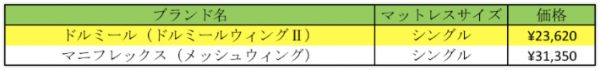 比較対象のモデルはドルミールウィングⅡで3つ折りタイプのものになります。マニフレックスは同じく3つ折りタイプのメッシュウィングを比較対象にしています。
