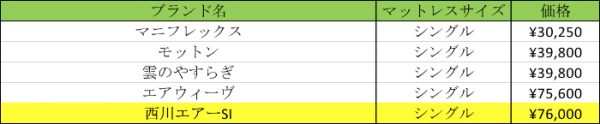 この表を見てわかりますが、西川エアーのSIモデルは他の高反発マットレスに比べて、とても高い値段で売られています。 なのでお手頃価格の寝具をお探しの方には、西川エアーの人気モデルは合わないかもしれないですね。