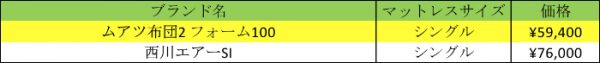 この表を見てもらえば理解出来ますが、ムアツ布団の方が若干安めです。西川エアーは寝具を購入する予算が高めの人じゃないと、買いずらい値段かもしれないですね。なので値段だけを見てみると、ムアツ布団の方が手に入れやすい事がわかります。