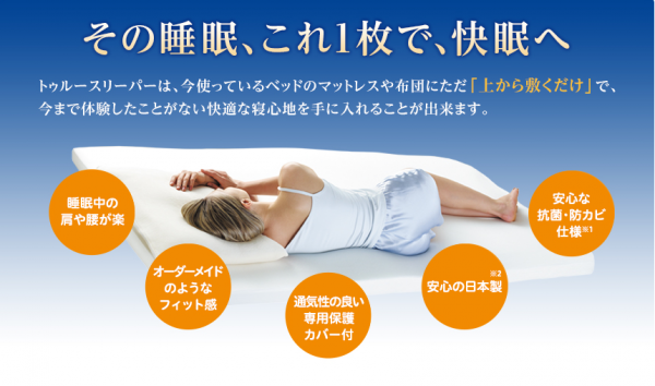 トゥルースリーパーはテレビ通販で有名なショップジャパンが販売する低反発マットレスです。低反発マットレスといえば、元祖低反発マットレスのテンピュールとこのトゥルースリーパーが有名ですね。